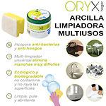 - Uso: Humedecer la esponja / estropajo, y frotar ligeramente la arcilla. A continuación frote la superficie a limpiar hasta que arrastre la suciedad, después aclare con agua y seque con un paño o papel de cocina hasta que quede brillante.
